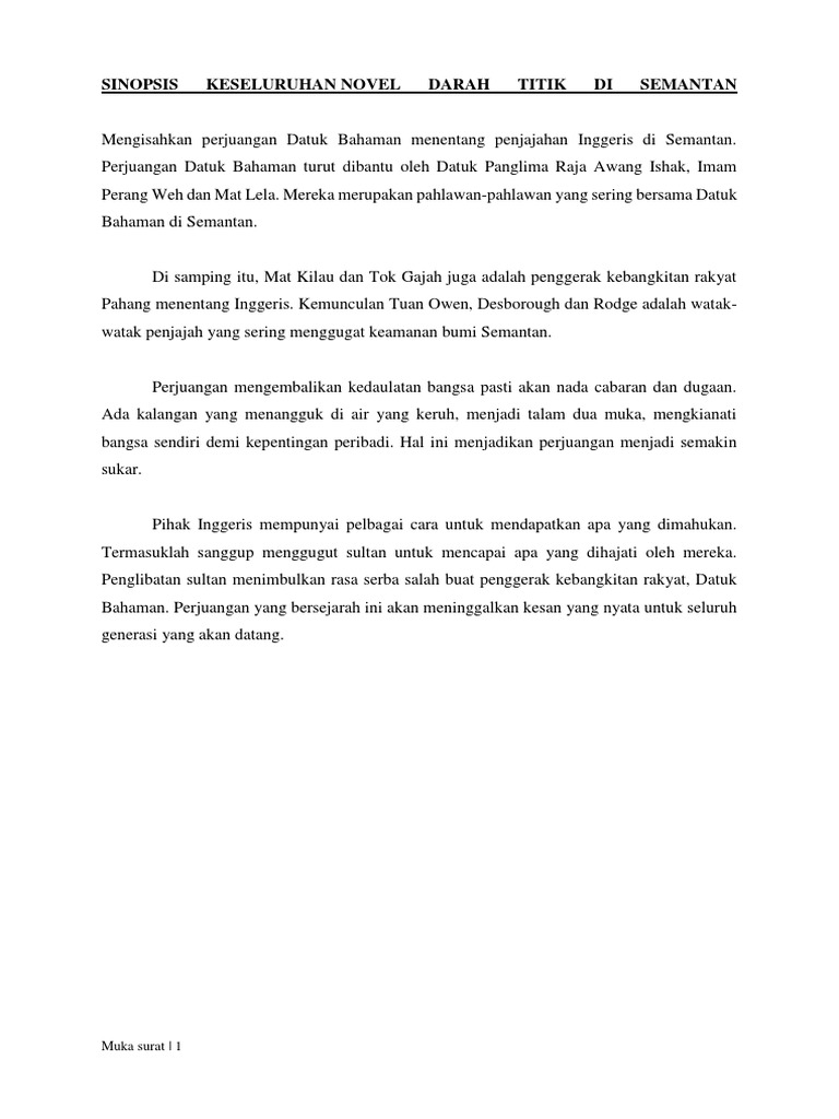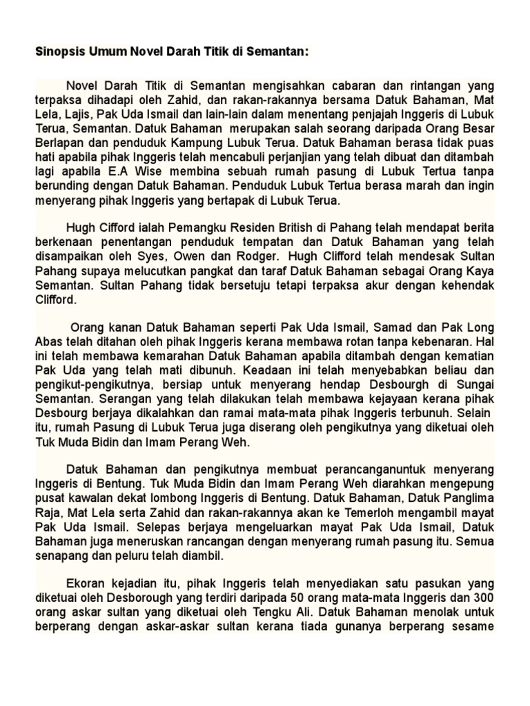 Sinopsis novel darah titik di semantan. Sinopsis darah titik di semantan 1 pilih jawapan yang paling sesuai id: Novel darah titik di semantan: Hal ini disedari oleh zahid, samad, rahman dan awang muhamad. Perubahan ini telah disedari oleh 'aku'. Novel ini bertemakan semangat patriotisme dalam kalangan anak watan untuk membebaskan tanah air daripada penjajah. Disamping itu, mat kilau dan tok gajah juga adalah penggerak kebangkitan rakyat pahang menentang inggeris. For more information and source, see on this link : For more information and source, see on this link : Sinopsis bab 5, 6 (novel tingkatan 2) bab 5: Mengisahkan perjuangan datuk bahaman menentang penjajahan inggeris di semantan. Zahid terkenang akan datuk bahaman, orang kaya semantan yang telah banyak. Cemas tengah hari itu, zahid, samad, rahman, dan awang muhammad berjalan ke masjid lubuk terua.