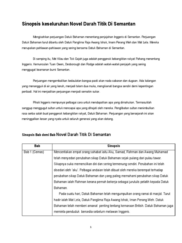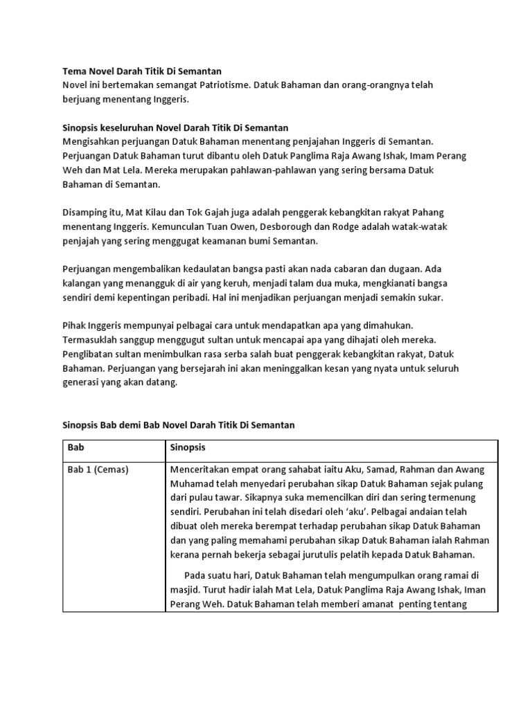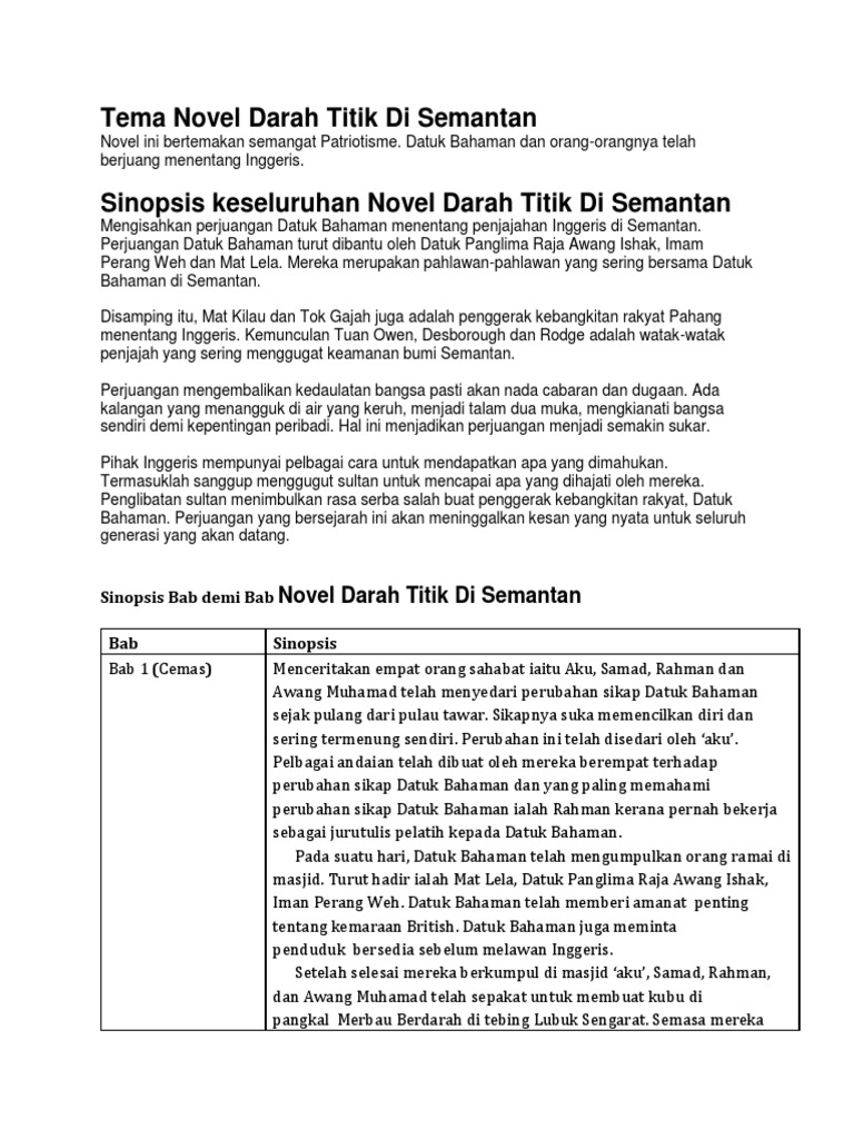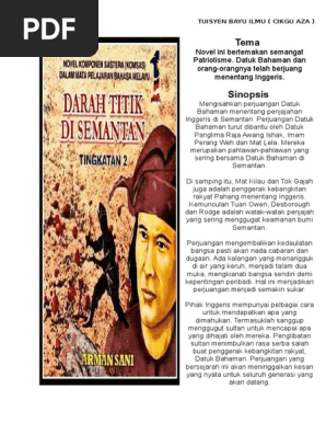 Sinopsis umum novel darah titik di semantan. Sinopsis bab 5, 6 (novel tingkatan 2) bab 5: Perubahan ini telah disedari oleh 'aku'. Bab 1 (cemas) menceritakan empat orang sahabat iaitu aku, samad, rahman dan awang muhamad telah menyedari perubahan sikap datuk bahaman sejak pulang dari pulau tawar. Novel bm / bahasa melayu tingkatan 2, pt3 (pentaksiran tingkatan 3).